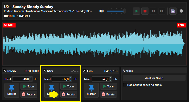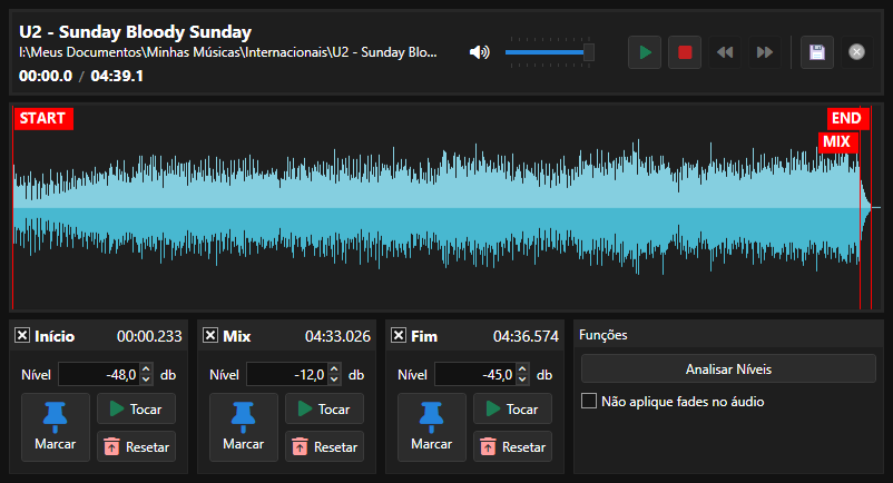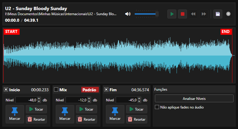 No editor, você poderá selecionar para ativar os pontos que deseja ativar na música, ou então entrar com os níveis em db e clicar na opção Analisar Níveis para que ele busque automaticamente. A opção Não aplique fades no áudio indica que não será aplicado fade-in ou fade-out naquele áudio.