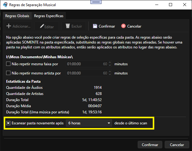 Junto as regras específicas na tela de Regras de Separação Musical, é possível selecionar um tempo específico para o escaneamento das pastas.