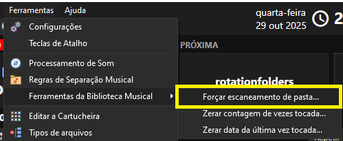 Caso você necessite escanear uma pasta novamente, por exemplo, após reorganizar o seu acervo musical, é possível fazer no menu Ferramentas > Ferramentas de Biblioteca Musical.
