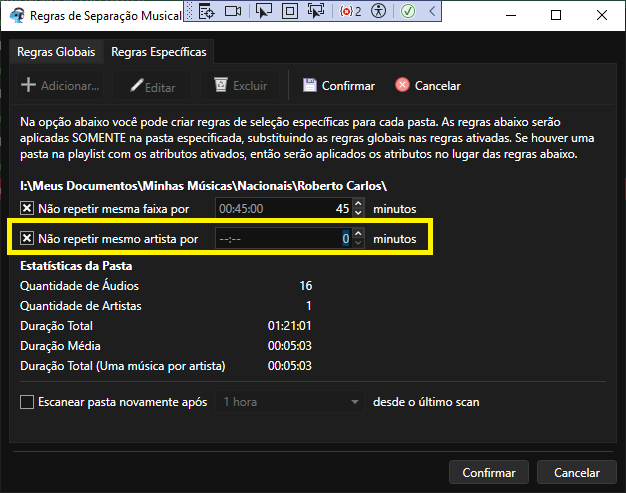 Note também que na parte acima não ativei as regras de "Não repetir mesmo artista" - isso não significa que a regra estará desativada, mas apenas que seguirá a regra global. Caso eu quisesse desativar a regra, deveria marcar a caixa ao lado e colocar o tempo como 0 (zero).